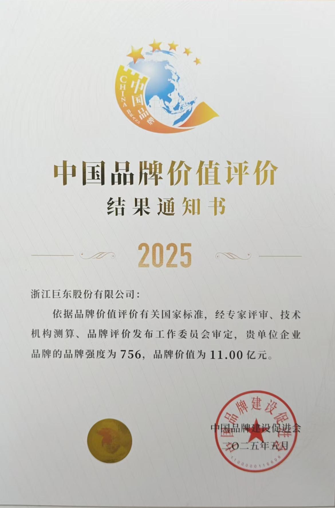 2025中國品牌價值評價結果通知書-品牌價值11億元